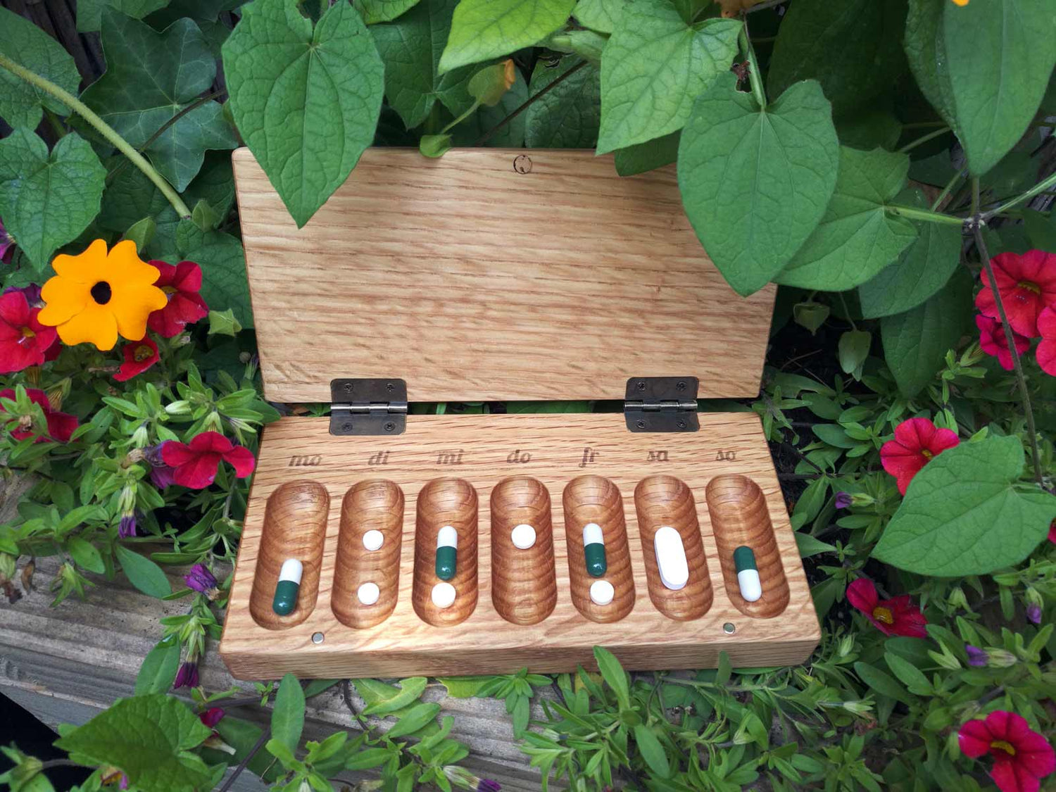 Tablettenboxen aus Holz: Für alle, die kurzlebige, oft weit fern produzierte, Plastikartikel reduzieren und ihrem Zuhause nachhaltig mehr Stil verleihen wollen. Ob für Pillen, Kapseln, Globuli, Vitamine, oder gar die tägliche süße Ration, unsere 7-Fächer-Tablettenbox aus massivem Holz schmückt die Alltagsroutine und bewahrt den Ästheten vor Kunststoffkammern und täglichem Blistergeknister.